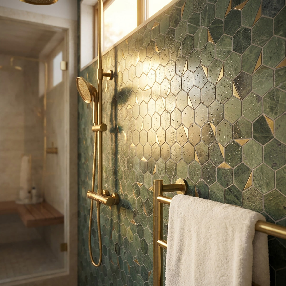Verde Tia Honed With Brass Hexagon 2 Marble Mosaic